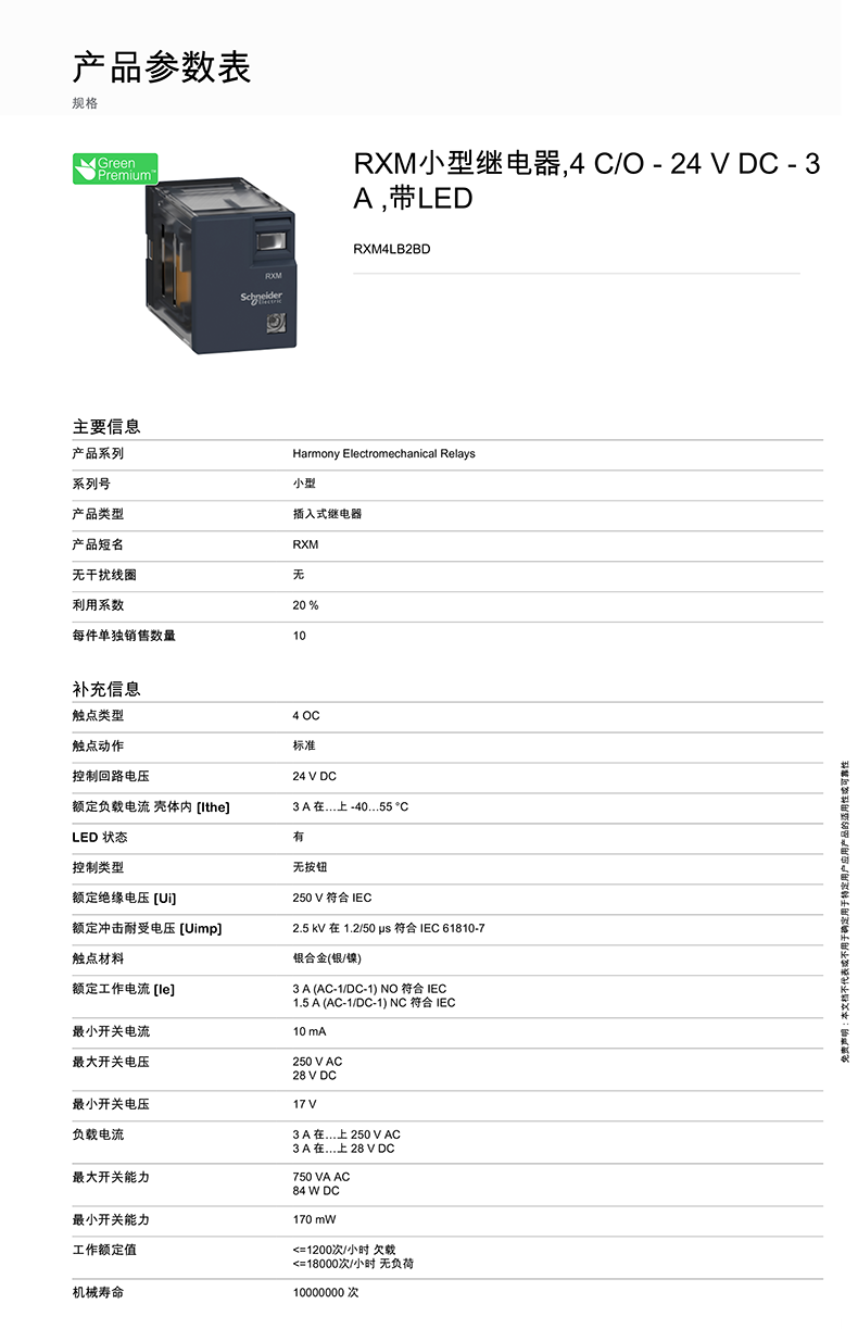 施耐德繼電器一級代理商,施耐德RXM中間繼電器,施耐德小型繼電器,施耐德插入式繼電器RXM4LB2BD產品參數表